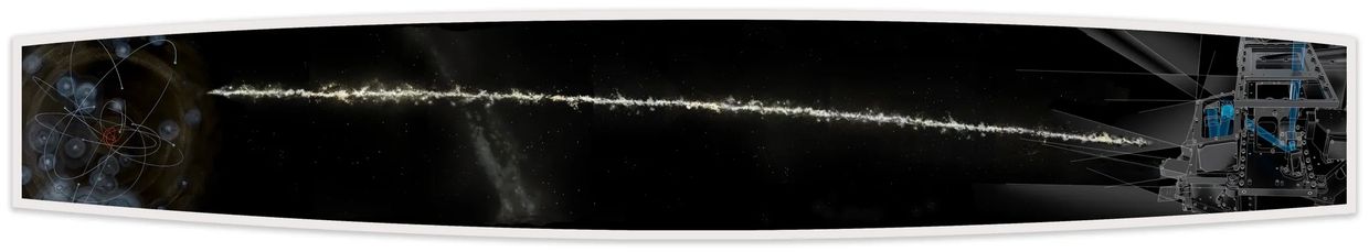 It is an image with two discrete parts: left and right; space and time; beginning and end; theoretical and material. The two sides are tenuously connected by an amorphous line that resembles dust, gas or cosmic debris. On the left: the black hole at the center of our galaxy with nine stars orbiting it. A black hole can be described as a zero-dimensional point of infinite density, a singularity where spacetime and general relativity break down catastrophically. However it is described, it remains unknowable and intangible.